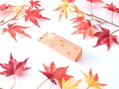 オレンジなイタリアンレザーにもみじを散りばめた、季節感ある秋の革小物です。