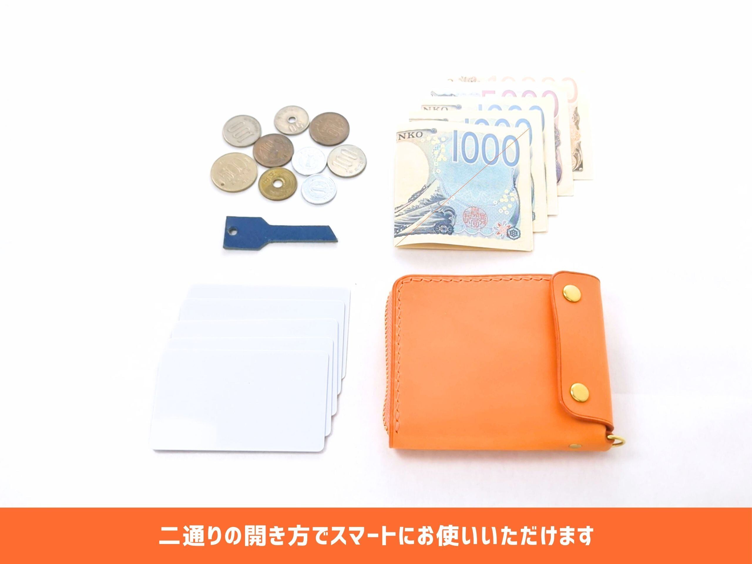 カードのみが必要な時はホック側、現金も合わせて必要なときはファスナー側と、二通りの開き方でスマートにお使いいただけます。